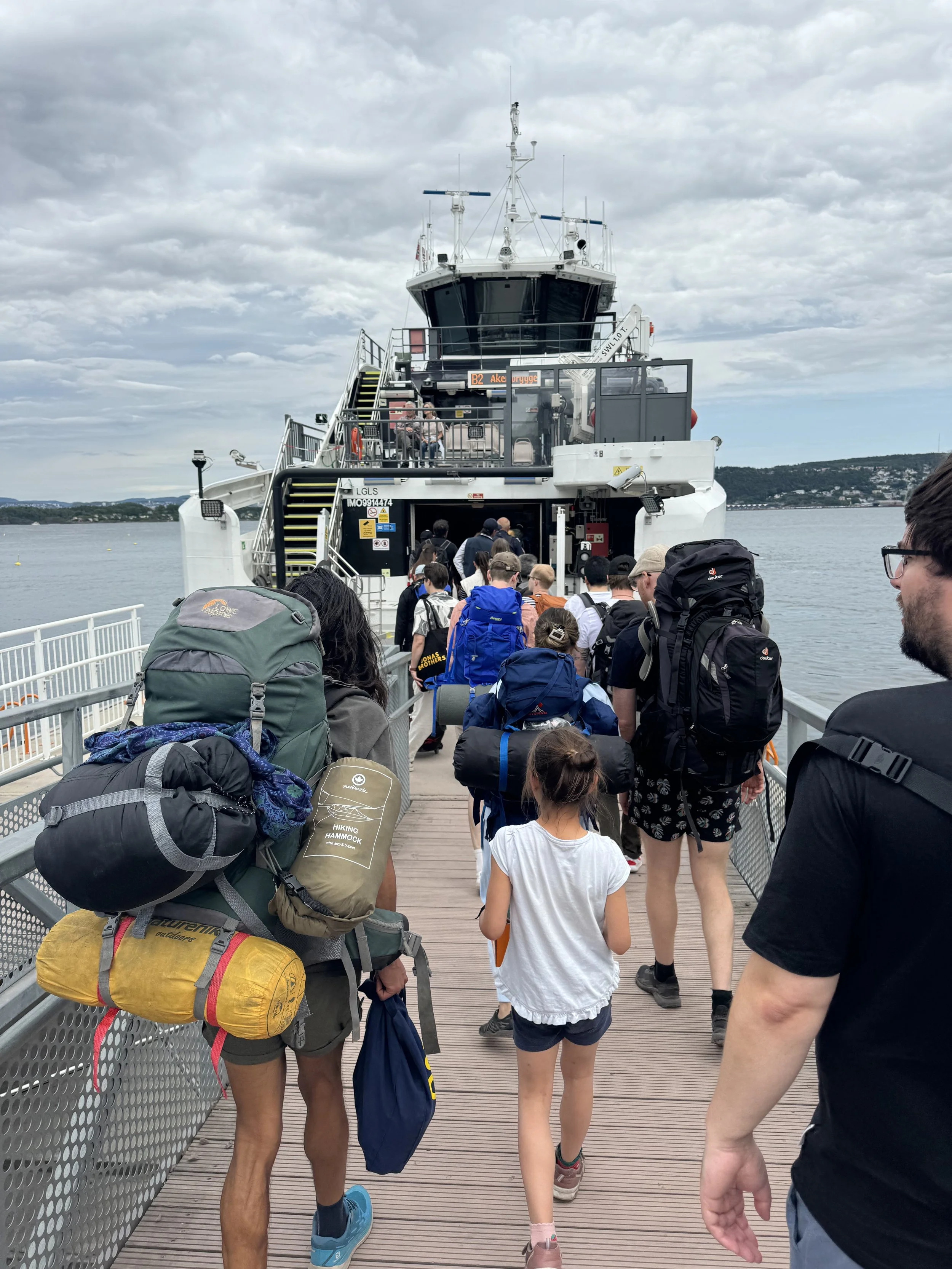 Boarding the ferry back to the mainland after camping